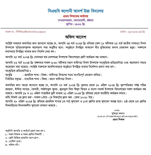 স্মারক নং: সিবিসিএএইচএস/এস/২০২৪/১৩ অফিস আদেশ তারিখ: ২১/০৩/২০২৪ খ্রিঃ সংশ্লিষ্ট সকলের অবগতির জন্য জানানো যাচ্ছে যে, আগামি ২৪ মার্চ ২০২৪ খ্রিঃ রবিবার বেলা ১২ ঘটিকায় ২৫ মার্চ জাতীয় গণহত্যা দিবস উপলক্ষে স্মৃতিচারণমূলক আলোচনা সভা অনুষ্টিত হবে। অনুষ্ঠানে উপস্থিত থাকবেন বীর মুক্তিযোদ্ধা জনাব মোহাম্মদ ছবুর। সকলকে যথাসময়ে উপস্থিত থাকার জন্য নির্দেশ দেয়া হল। আগামি ২৫ মার্চ ২০২৪ খ্রিঃ সোমবার শুভ দোলযাত্রা উপলক্ষে বিদ্যালয়ের শ্রেণি কার্যক্রম বন্ধ থাকবে। আগামি ২৬ মার্চ ২০২৪ খ্রি: মঙ্গলবার সকাল ৯:৩০ ঘটিকায় মহান স্বাধীনতা দিবস উপলক্ষে সাংস্কৃতিক প্রতিযোগিতা এবং আলোচনা সভার আয়োজন করা হয়েছে। সংশ্লিষ্ট সকলকে আবশ্যিকভাবে অনুষ্ঠানে উপস্থিত থাকার নির্দেশনা প্রদান করা হল। সাংস্কৃতিক প্রতিযোগিতা: আবৃত্তি - প্রাথমিক শাখা। বিষয়: স্বাধীনতা দিবসের সাথে সংগতিপূর্ণ যেকোন কবিতা। নির্ধারিত বক্তৃতা - মাধ্যমিক শাখা। বিষয়: মহান স্বাধীনতা দিবস। অবগতির জন্য আরো জানানো হচ্ছে যে, আগামি ২৭ মার্চ ২০২৪ খ্রি: বুধবার থেকে ১৮ এপ্রিল ২০২৪ খ্রিঃ বৃহস্পতিবার পর্যন্ত পবিত্র রমজান, ইস্টার সানডে, বৈসাবী, লাইলাতুল ক্বদর, জুমাতুল বিদা ঈদুল ফিতর ও বাংলা নববর্ষ উপলক্ষে বিদ্যালয়ের সকল কার্যক্রম বন্ধ থাকবে। আগামি ১৯ ও ২০ এপ্রিল সাপ্তাহিক ছুটি থাকায় ২১ এপ্রিল ২০২৪ খ্রিঃ রবিবার থেকে যথারীতি কার্যক্রম চলবে। মর্নিং শিফট এর ক্লাস শুরু: সকাল ৮টায়। ডে শিফটের ক্লাস শুরু: বেলা ১০:২০ টায়। আগামি ২৮ এপ্রিল ২০২৪ খ্রি: রবিবার প্রাথমিক শাখার ১ম পাঠ মূল্যায়ন ও ১০ম শ্রেণির প্রাক্ মূল্যায়ণ আরম্ভ হবে। ৬ষ্ঠ থেকে ৯ম শ্রেণির শিক্ষাথীদের শিখণকালীন মূল্যায়ণ চলমান থাকবে। স্বাক্ষরিত মুজিবুর রহমান এম.এস.এস. (পি.সায়েন্স) বিএড (১ম শ্রেণি) এম.এড (১ম শ্রেণি) প্রধান শিক্ষক অনুলিপি অবগতি ও কার্যার্থে প্রেরণ করা হলঃ ১। সকল শিক্ষক ও সকল শ্রেণির শিক্ষার্থী। ২। শ্রেণি ভিত্তিক হোয়াটস অ্যাপ গ্রুপ। ৩। নোটিশ বোর্ড। ৪। অফিস নথি।